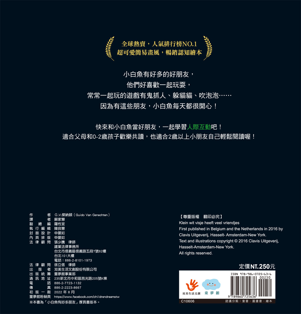 ‧刺激視覺發展:以黑色為主,搭配小白魚的白色,強烈對比,吸引寶寶目光。