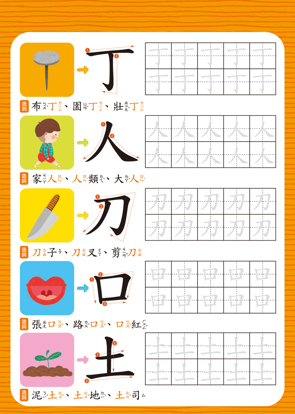 基礎國字內含60個常見國字,用圖像聯想方式看圖識字,