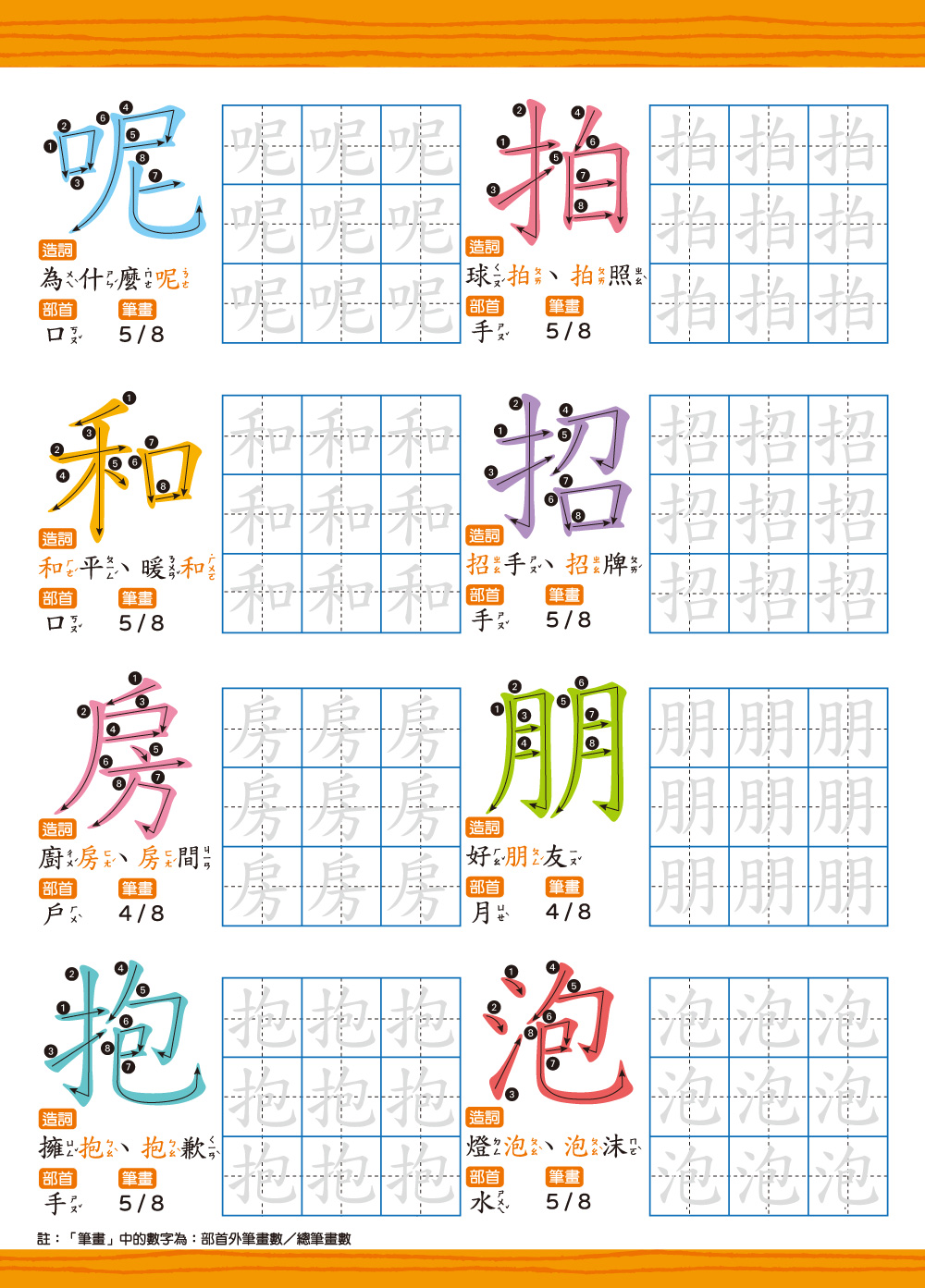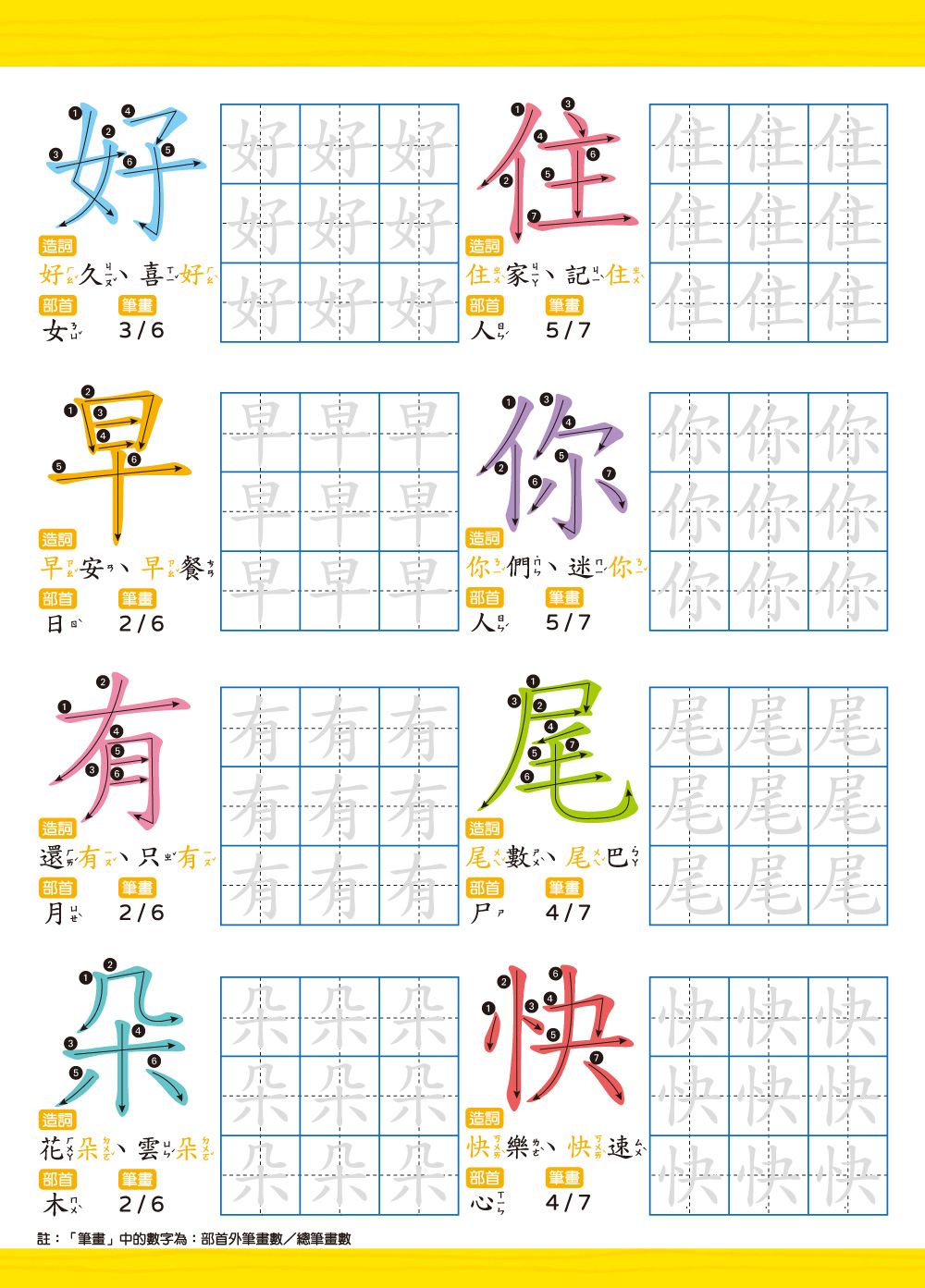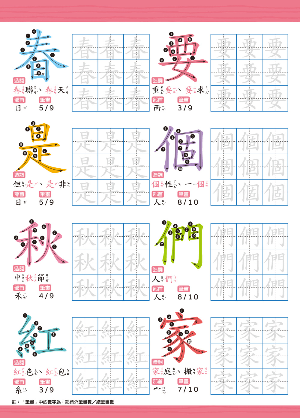 筆順+部首+筆畫+造詞,由淺入深學習,奠定書寫基礎。
