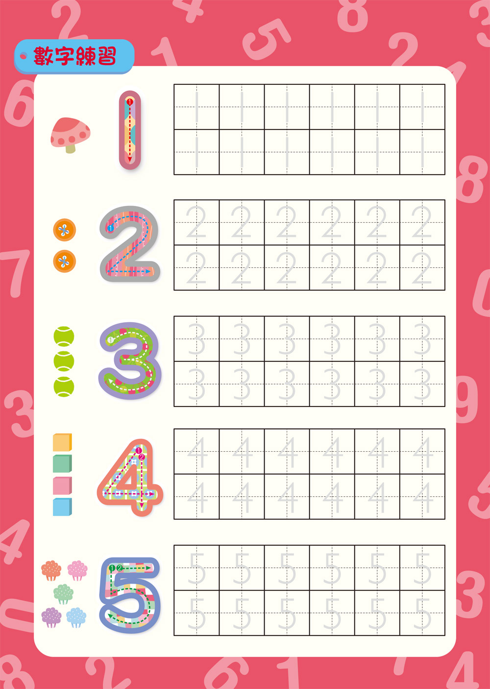 從運筆遊戲→數字筆順練寫→數數練習,