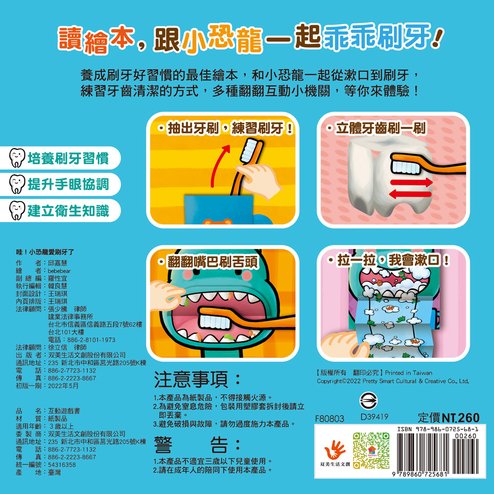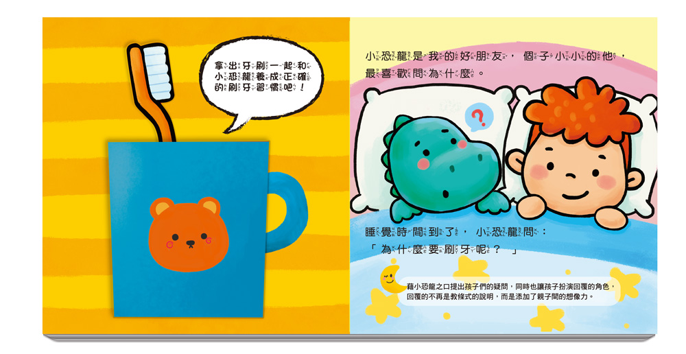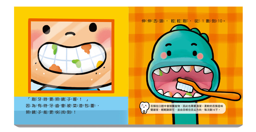 而在觀察書中小恐龍和小朋友刷牙的過程中,搭配多種驚喜小機關,不僅讓閱讀變得更有趣,也能激發孩子主動學習刷牙知識的渴望