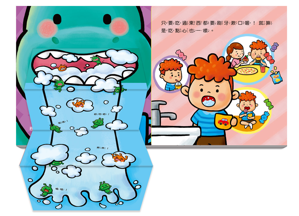 4.多種互動機關吸引孩子動手操作。(抽出牙刷、刷刷立體牙齒、拉下漱口拉頁、翻開嘴巴……等。)