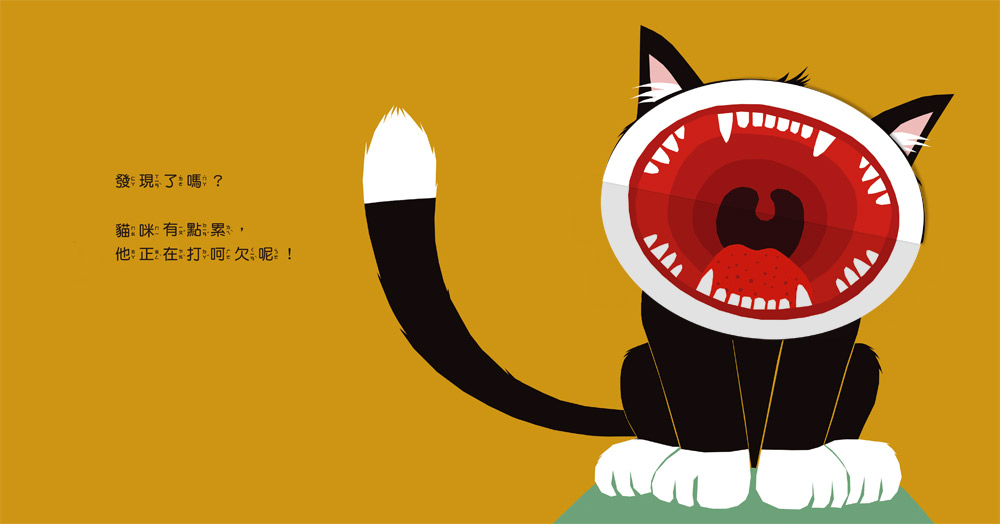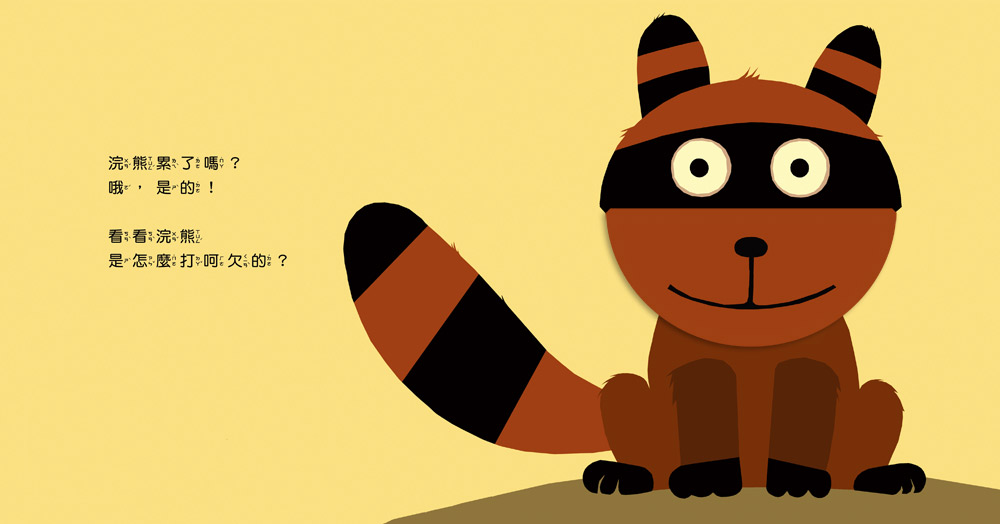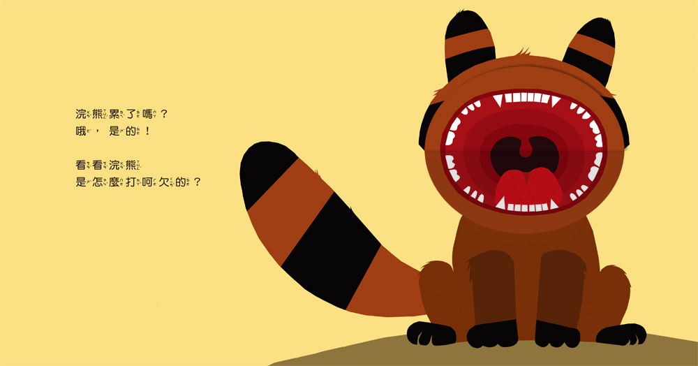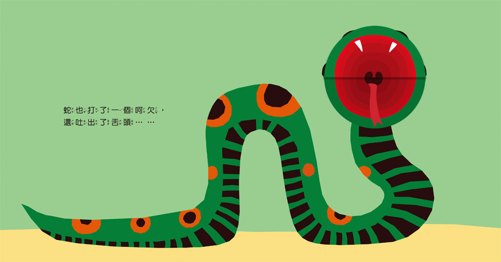 的小動物,講述人人都會有的自然生理反應——打呵欠,透過有趣的翻頁設計,讓孩子了解動物嘴巴構造,也可以讓孩子試著