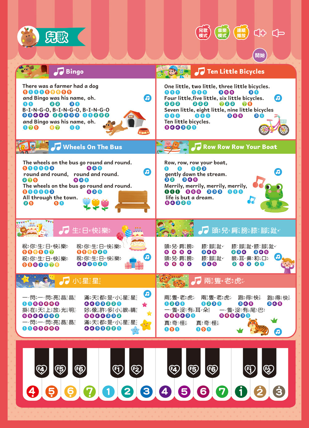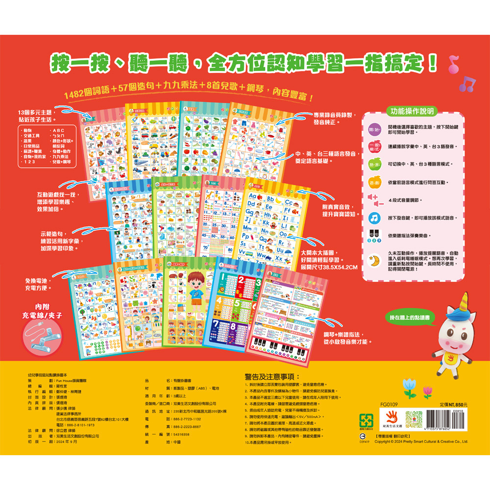 共13大主題,含1482個詞語+57個造句+九九乘法+8首兒歌+鋼琴