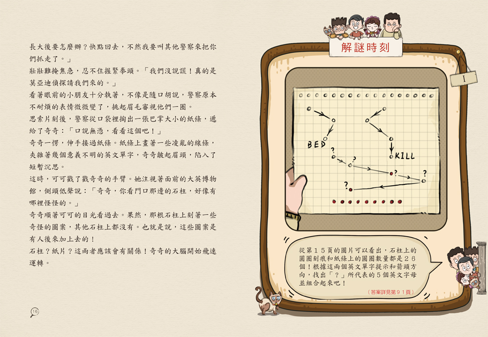 解謎題型豐富,包括圖形題、邏輯題、字謎、成語謎題、變形數獨、迷宮、摩斯密碼……等,讓孩子在推理過程中鍛鍊觀察力、邏輯思維與獨立思考能力,閱讀更有參與感。